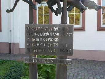 | Keywords: Kriegerdenkmal Maikammer 02.jpg de Inschrift unter den Apokalyptischen Reitern vor der katholischen Kirche St Kosmas und Damian in Maikammer <br/>Der Krieg ist verderblich <br/>Länder werden verwüstet <br/>Menschen gemordet <br/>Säuglinge zertreten <br/>Tugenden verleugnet <br/>Gib uns Frieden o Herr own Immanuel Giel 2010-09 Apokalyptische Reiter Maikammer |