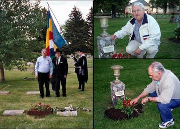 | Keywords: Kristina Erlandsdotter Ridderstedt death centenary 2007.JPG en Descendants of Kristina Erlandsdotter Ridderstedt pay tribute to her at the exact same time on the 100th anniversary of her death left at the grave of her eldest son Calvin Buzz Curtis Jacob Truedson Demitz with banner held by Emil Eikner ; right at her grave Anders Bergman Hans Bäck <br>Place left Greenhill Cemetery Laramie WY; right Stora Tuna Churchyard Borlänge Sweden User EmilEikS/Template Southerly Clubs Spike Jorgensen for FamSAC 2007-06-05 Southerly Clubs Image Archives Ristesson History Graves in Sweden FamSAC Graves in Wyoming Anniversaries Stora Tuna kyrkogård Kristina Erlandsdotter Ridderstedt Laramie Wyoming Trued Family reunions Jacob Truedson Demitz National Costume of Sweden of 1778 FamSAC banner |