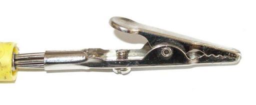 Keywords: Kroko.jpg Krokodilklemme mit 4-mm-Bananensteckerhülse Alligator clip on a 4mm banana plug own 2008-03-26 Ulfbastel PD Alligator clips Banana plugs