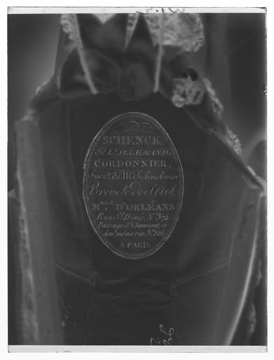 | Keywords: Kröningssko för drottning Desideria (1777-1860) - Livrustkammaren - 70844-negative.tif LSH artwork Schenk Skomakare sv Skorna avsedda för kröningen 21/8 1829 men företer inga spår av att ha begagnats Skon av ben vit sidenatlas med påsydda kronor av guldpaljetter och kantiljer runt ringningen mitt fram en störe sluten krona Mycket smal och rak läst Ovanläder och bakkappa förenas genom sidsöm I hälpartiet är en kilklack insydd mellan sulorna den är 23 mm hög Bakkappan fodrad med glacé ovanlädret md vit lärft Mitt fram en platt rosett av 13 mm brett sidenband I ringningen som är skodd med vitt taftband är en dragsko med trikåband att knyta framtill På sidorna strax bakom sömmarna 430 mm långa taftband Den smala lädersulan stämplad P och försedd med 2 små pinnhålsstämplar intill hålfoten original caption Desiderias kröning 1829 gold - goatskin Färg benvit material getskinn - leather Färg ljusbrun material nötläder - silk Färg benvit d1 - dräkt - yttermaterial material sidenatlas - linen Färg naturfärg material linne - silk Färg benvit material siden size mm 60 size mm 45 size mm 215 size mm 23 klack g 35 LRK Desideria av Sverige-Norge Johanna Cornelia Soret Estrid Hylin f Rundquist fru Desideria av Sverige-Norge Empiren i Sverige 1991-1992 Skor ger mer - makt flärd magi 2007 SCHENK // dit L'ALLEMAND // CORDONNIER // Succr de Mr Schacherer // Breveté de S A S // MLLE D'ORLEANS // Rue St Denis No 374 // Passage St Chaumont ci // dev même rue No 226 // A PARIS Schenk SCHENK // dit L'ALLEMAND // CORDONNIER // Succr de Mr Schacherer // Breveté de S A S // MLLE D'ORLEANS // Rue St Denis No 374 // Passage St Chaumont ci // dev même rue No 226 // A PARIS Schacherer place of origin original filename LN_E02344 54162 inventory number LRK 17567 70844 CC0 Kröningssko för drottning Desideria 1777-1860 - Livrustkammaren - 70844 tif <gallery caption Different images of same object > File Desiderias kröningsskor 1829 Bild tagen till utställningen Skor ger mer 2007 - Livrustkammaren - 23734 tif File Kröningssko för drottning Desideria 1777-1860 - Livrustkammaren - 26908 tif File Kröningssko Desideria - Livrustkammaren - 24065 tif </gallery> |