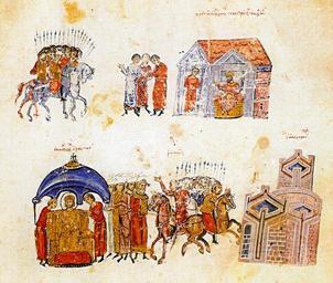 | Keywords: KrumAndMichael.jpg К ум го е и ихаил I Рангаве долу п еди Битката п и Ве синикия 813 Krum oben и Michael I Rhangabes unten vor der Schlacht bei Versinikia 813 Krum top and Michael I Rangabe bottom before the Battle of Versinikia 813 en Madrid Skylitzes fol 11r detail en Madrid Skylitzes from the Middle Ages unknown 11th-13th centuries <gallery> File MadridSkylitzesMichaelRhangabesKrumFol11r jpg File Krum gathers his people The Chronikon of Ioannis Skylitzes jpg </gallery> PD-old-100 Krum of Bulgaria Madrid Skylitzes Michael I Rhangabes Battle of Versinikia Bulgarians in Medieval art Medieval miniatures of historical persons |