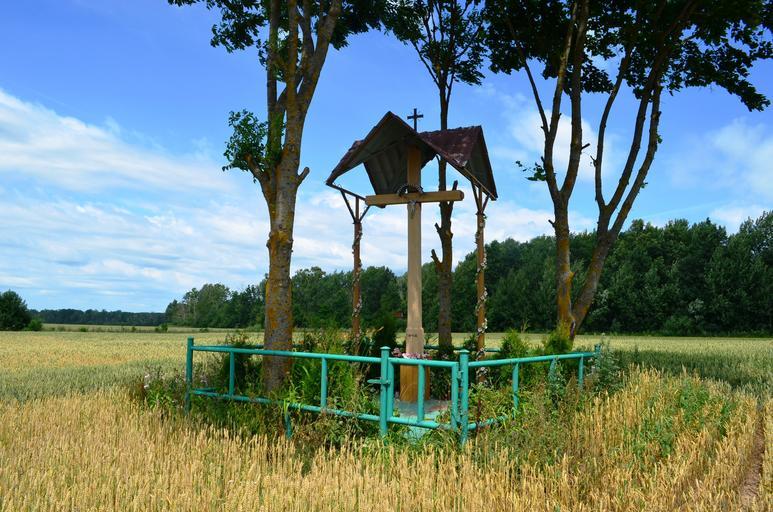 Keywords: Kryžius buv Pacūnų kaime.JPG Kryžius buvusio Pacūnų kaimo valdoje Kėdainių raj own work 2013-07-18 Šarūnas Šimkus Wooden crosses in Lithuania Kėdainiai District Municipality Kryžiai su koplytelės tipo apvadu ar stogu centre