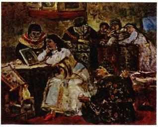 | Keywords: Kseniya Godunova (Vasily Surikov).jpg Ца евна Ксения Годунова у по т ета уме шего жениха ко олевича Эскиз неосуществлённой ка тины 1881 г Холст масло Госуда ственная Т етьяковская гале ея http //otkritka-reprodukzija blogspot com/2008/04/blog-post_13 html 1881 Creator Vasily Ivanovich Surikov PD-old-auto 1916 Ksenia Godunova History paintings by Vasily Surikov John of Denmark 1583 1602 | ||||