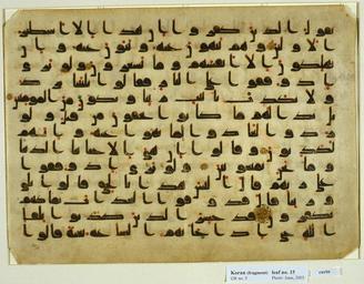 | Keywords: Kufi - D Va style.jpg en Verses 19-31 of the 6th chapter of the Qur'an entitled Surat al- An'am The Cattle The text's Kufi script appears related to the D Va style typical of horizontal Qur'ans produced on parchment during the 9th-10th centuries http //hdl loc gov/loc amed/ascs 293 Library of Congress Unknown Calligrapher 9th-10th centuries PD-Art Kufic style Qur'an manuscripts 9th-10th century Library of Congress Arabic Persian and Ottoman calligraphy collection | ||||