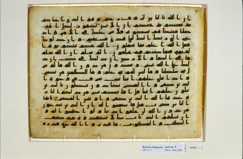 | Keywords: Kufi - E style.jpg  en Verses 74-78 of the 22nd chapter of the Qur'an entitled Surat al-Hajj The Pilgrimage as well as the first eight verses of the 23rd chapter of the Qur'an entitled Surat al-Mu'minun The Believers The text is executed in Kufi script close to the E style typical of horizontal Qur'ans produced on parchment during the 9th-10th centuries http //hdl loc gov/loc amed/ascs 287 Library of Congress Unknown Calligrapher century 9 PD-Art Kufic style Qur'an manuscripts 9th century Library of Congress Arabic Persian and Ottoman calligraphy collection |