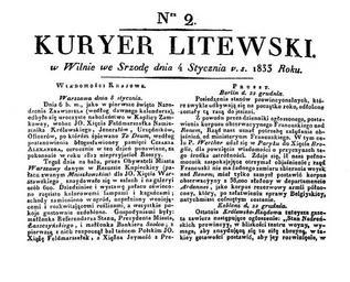 | Keywords: Kurier Litewski 1833 n 2 - newspaper.jpg en first page of newspaper Kuryer Litewski 2 1833 AD Russian empire ru пе вая ст аница газеты Kuryer Litewski 2 1833 г на польском языке be пе шая ста онка газеты Kuryer Litewski 2 1833 г на польскай мове newspaper Kuryer Litewski 2 1833 AD Russian empire page 1 own work 2013 free public domain Газеты на польскай мове Газеты Расійскай імпе ыі Газеты Бела усі Газеты Літвы Cc-zero Uncategorized 2013 January 24 | ||||