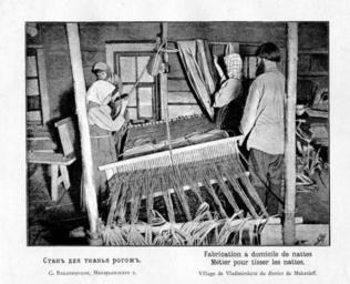 | Keywords: Kustari 062 Stan dlja tkanja rogozh.jpg en Handicraft Industry and Trades of Nizhegorodskaja gubernija Vladimirskoe XIX c ru Куста ные п омыслы и емёсла ижего одской губе нии Стан для тканья огож Село Владими ское ака ьевского уезда 1896 год Скани ован из книги ижего одская губе ния по исследованиям губе нского земства Выпуск II Куста ные п омыслы ижего одской губе нии / сост А Плотников СПб 1896 еизвестный фотог аф конца XIX века 1896 PD-old Handicraft Industry of Nizhny Novgorod province |