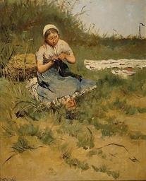 | Keywords: Kuyck Knitting Girl.jpg Frans Pieter Lodewyk van Kuyck 1852 “1915 Peasant girl knitting while waiting for the laundry to dry in the sun Oil on canvas c 50 x 40 cm PD-art Source http //www henrys de/ Frans Van Kuyck Knitting in art Laundry in art Drying laundry Paintings of women sitting on the ground outdoors Artworks missing infobox template |