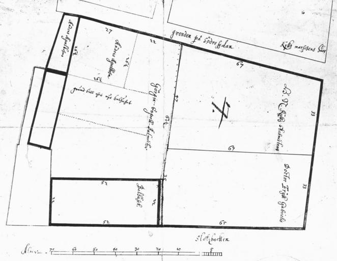 Keywords: Kvarteret Europa 1648.jpg sv Kvarteret Europa med Stora Bollhuset och planering för Lilla Bollhuset norr och Slottsbacken är nedåt Digitala Stadsmuseet author 1648 PD-old Kvarteret Europa Stora Bollhuset