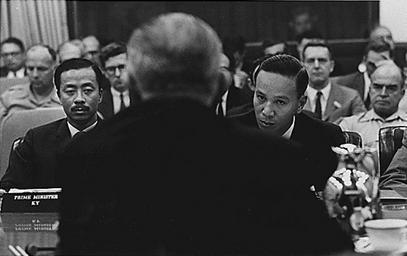 | Keywords: Ky LBJ Thieu HonoluluJuly1968.jpg Nguyễn Cao Kỳ South Vietnam U S president Lyndon B Johnson with back to camera and President Nguyễn Văn Thiệu South Vietnam meeting in Honolulu Hawaii in July 1968 NARA-image 192496 Creator Yoichi Okamoto 1968-07 Renamed and converted to JPEG of File Honolulu Conference Prime Minister Nguyen Cao Ky South Vietnam and Lieutenant General Nguyen Van Thieu South - NARA - 192496 tif People of the Vietnam War Lyndon B Johnson in 1968 07 Black and white photographs Nguyen Cao Ky Nguyen Van Thieu Photographs by Yoichi Okamoto PD-USGov |