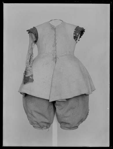 | Keywords: Kyller Dirschau - Livrustkammaren - 60031.tif Kyller använt av Gustav II Adolf vid Dirschau den 6 augusti 1627 w Buff coat used by Gustavus Adolphus of Sweden at the Kyller av älghud med ärmar av siden numera endast fragment kvar Kyllret är kraglöst och avskuren i midjan med långa skört 4 stycken <br/><br/>Längd mitt fram liv 36 5 cm skört 41 5 cm <br/>Bröstvidd 105 cm <br/>Längd mitt bak liv 41 5 cm skört 40 5 cm <br/>Ryggbredd 40 cm <br/>Midja 106 cm <br/>Vidd skörtens nederkant 281 cm <br/>Längd i sida liv 24 cm skört 43 3 cm <br/>Axelbredd 17 6 cm <br/>Ärmlängd 69 cm största ärmvidd 34 cm ärmvidd nedtill 28 cm <br/>Ärmsprundet är 18 cm Åtta knapphål vänster ärm har 4 silvertrådsklädda knappar och höger ärm har 7 knappar kvar <br/>Ärmens innersöm har en 15 5 cm lång öppning med 8 öglor av silvertråd på var sida över var ögla sitter en sydd träns av sysilke <br/><br/>Sömmarna runt framkant hals på axlar och längs skörtens sidor är dekorationsstickade med tre parallella sömmar i vit lintråd Snörning mitt fram med nio grupper med två hål i varje grupp på var sida Snörningen har blodfläckar Skörtets söm mitt bak på höger bakstycke har gått upp ca 1 cm Ärmarna har rester av sitt yttertyg ett ljust brun atlas samt ett foder av ljust brun taft Kyllret har axelkarmar och endast mycket små rester av atlasen finns kvar däremot återstår det mörkt bruna kanvasen som utgjort mellanlägg i tre lager tyg Kanvasen är belagd med en yta för styvnadens skull Livet i kyllret är fodrat med vitt linne förmodligen som mellanfoder w Buff coat of elk hide with sleeves made of silk of which now only fragments remain The coat is collarless and seamed at the waist with long skirts in four pieces Center front length body 36 5 cm 41 5 cm skirts Chest 105 cm Center back length 41 5 cm body skirts 40 5 cm Back width 40 cm Waist 106 cm Width skirt hem 281 cm Length at side body 24 cm 43 3 cm skirts Shoulder Width 17 6 cm Sleeve length 69 cm Maximum sleeve width 34 cm Sleeve width at bottom 28 cm Sleeve opening 18 cm Sleeves have eight buttonholes; the left sleeve has four silver-wrapped thread covered buttons and the right sleeve has seven buttons left The coat's inseam has a 15 5 cm long opening with 8 loops of silver wire On each side of the loop is a stitched tack of sewing silk The seams around the front edge of the neck the shoulders and along the sides of skirt are decorated with three parallel rows of stitching in white linen thread The lacing at the front has nine groups of two holes in each group on each side The lacing has blood stains Skirt seam at center back on the right rear panel has gone up about 1 cm The sleeves have the remains of their outer shell a light brown silk atlas satin and a lining of light brown taffeta The coat has shoulder wings with only small remnants of the atlas remaining over the dark brown the canvas that formed inserts in the three-layer fabric The canvas is coated with a surface for stiffenings' sake The body of the coat is lined with white linen presumably as interlining original caption kyller Dirschau - LRK 31194 Slaget vid Dirschau Battle of Dirschau 1627 silk d1 - dräkt - yttermaterial material siden size mm 365 mitt fram LRK Gustav II Adolf av Sverige Gustavus Adolphus of Sweden Basutställning Gustav II Adolf Minnesutställning 1932 1932 place of origin original filename LN_A01077_001077 67807 inventory number LRK 31194 60031 CC0 Kyller Dirschau - Livrustkammaren - 60031-negative tif <gallery caption Different images of same object > File Kyller använt av Gustav II Adolf vid Dirschau den 6 augusti 1627 - Livrustkammaren - 61181 tif File Detaljbild på axelstycke Gustav II Adolfs älghudsskyller från Dirschau år 1627 - Livrustkammaren - 65278 tif File Detaljbild på ärm Gustav II Adolfs älghudsskyller från Dirschau år 1627 - Livrustkammaren - 22477 tif File Kyller Dirschau - Livrustkammaren - 42910 tif File Kyller använt av Gustav II Adolf vid Dirschau den 6 augusti 1627 - Livrustkammaren - 44060 tif File Gustav II Adolfs dräkt från slaget vid Dirschau 1627 - Livrustkammaren - 56717 tif File Kyller använt av Gustav II Adolf vid Dirschau den 6 augusti 1627 - Livrustkammaren - 35501 tif File Detaljbild ena armen på Gustav II Adolfs älghudsskyller från Dirschau år 1627 - Livrustkammaren - 73840 tif File Detaljbild på tyg Gustav II Adolfs älghudskyller från Dirschau år 1627 - Livrustkammaren - 13914 tif File Kyller Dirschau - Livrustkammaren - 51470 tif File Kyller använt av Gustav II Adolf vid Dirschau den 6 augusti 1627 - Livrustkammaren - 52620 tif </gallery> Media contributed by LSH unmatched event Media contributed by LSH unmatched material Buff coats Media contributed by LSH unmatched objKeyword Clothing in Livrustkammaren Media contributed by LSH 2013-10 |