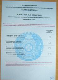 | Keywords: KZ2011PresElectionVotingSheet.JPG en The voting ballot for 2011 Kazakhstan Presidential Election ru Изби ательный бюллетень в П езидентских выбо ах в Казахстане 2011 Self-made photo of the voting ballot Central Election Committee od the Republic of Kazakhstan 2011-04-03 PD-KZ-exempt Kazakhstan in the 2010s Ballot papers in Kazakhstan |