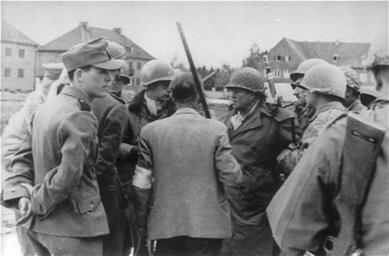 | Keywords: Kz dachau liberation person.jpg en SS men conference with Gen Henning Linden during liberation of the dachau concentration camp Pictured from left to right SS aide camp leader Untersturmführer Heinrich Wicker mostly hidden by the aide Paul Levy a Belgian journalist person with helmet looking to his left Dr Victor Maurer back General Henning Linden person with helmet looking to his right and some US soldiers Picture is taken from the USHMM de SS-Soldaten und General Henning Linden während der à bergabe in Folge der Befreiung des Konzentrationslagers Dachau durch die US-Arme 1945 Von links vorne SS-Helfer Lagerkommandant Untersturmführer Heinrich Wicker überwiegend verdeckt der belgische Journalist Paul Levy links neben Victor Mauerer mit dem Rücken zur Kamera Rechts davon General Henning Linden mit Netzhelm und andere Soldaten der US-Armee Fotografie USHMM United States Holocaust Memorial Museum PD-USGov Dachau liberation Dachau concentration camp in 1945 Images from the United States Holocaust Memorial Museum |