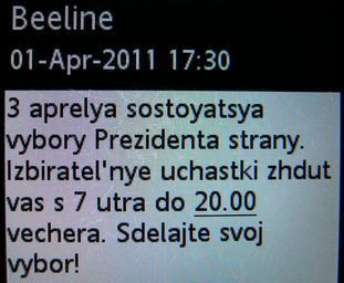| Keywords: KZelectionSMSinvitation.jpg en The snapshot of a mobile phone screen displaying an SMS with invitation to the Presidential election in Kazakhstan 2011 This official text was created by the Central Election Committee of Kazakhstan and due to it it is in public domain ru Снимок эк ана сотового телефона с SMS-сообщением п изывающим участвовать в голосовании на П езидентских выбо ах в Казахстане 2011 год Текст создан Цент альным изби ательным комитетом Казахстана и находится в общественном достоянии own snap by Ds02006 own snap by Ds02006 2011-04-01 PD-KZ-exempt Kazakhstan |