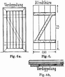 | Keywords: L-Tuer2.png Lueger Lueger/Doors de A Aeußere Türen welche den Einflüssen des Wetters und der Feuchtigkeit ausgesetzt sind müssen von starkem Holze und ohne Leim zusammengesetzt sein In ihrer einfachsten Form werden sie vom Zimmermann erstellt Die rauhen oder gehobelten Bretter werden stumpf gefügt oder gespundet oder in Nut und Feder nebeneinander gesetzt und auf Querleisten mit Strebebug mittels Nägeln oder Schrauben befestigt Fig 6 Größere Türen und Torflügel erhalten noch Schlag- oder Wandsäulen mit mehreren Riegeln und Bügen Aehnlich sind auch große Kirchentüren mit mehreren Strebebügen zu bilden Als Vorbild können hierfür die Türen der St -Chapelle in Paris gelten 4 Soll die Türe zur Abhaltung von Kälte und Hitze dienen oder die Ausgleichung der Außen- und Innentemperatur verhindern so genügt eine einfache Brettdicke nicht; es wird die Türe sich werfen Die einfachste Verstärkung bilden aufgesetzte Friese in weiten oder engen Feldern die bis zu einer Ausschmückung der Außenfläche sich entwickeln lassen Besser dient die Verdoppelung eine zweite Brettlage welche auf die Blindtüre aufgenagelt wird Dies kann in senkrechter Fig 6a und 6b wagerechter mit Ueberfälzung Fig 7 oder schräger Richtung verstrebend geschehen Als beste aber gilt die gestemmte Türe aus Rahmwerk mit Füllungen bestehend wobei die Rahmen oder Friese durch Schlitzzapfen miteinander verbunden und an ihren Kanten mit Hobel oder Profil versehen sind entweder glatt in Fasen mit Kehl- oder Karniesprofil Fig 8 a b c welche je nach der Stärke eine einfachere oder reichere Wirkung zeigen “ Die Füllungen ob glatt oder abgeplattet sind 5 a eingestemmt s Bd 3 S 239 in eine Nut zwischen den Profilen des Frieses b in den Falz gelegt mit aufgesetztem Kehlstoß Fig 9 oder bei sehr starken Rahmen und Füllungen c überschoben Fig 10 Die Einteilung erfolgt in quadratischen oder länglichviereckigen Feldern oder aber mit durchbrochenen vergitterten und verglasten Oeffnungen im oberen Teile zur Erhellung des Innern Da über eine Höhe von 3 0 m die Flügel sich verziehen ist bei größerer Höhe ein Oberlicht s Bd 6 S 727 anzubringen und für den oberen Anschlag des Türflügels ein Kämpferholz s Latteibrett Bd 6 S 74 Vorteilhaft ist es die gestemmten Türen tief in Nischen hineinzulegen um sie den Einflüssen des Regens und der Feuchtigkeit zu entziehen B Innere Türen werden unter Anwendung des Leims erstellt In einfachster Gestaltung erscheint sie als 1 Glatte Türe mit Querleisten Hierbei sind jedoch die Bretter in ganzer Breite zu einer Tafel Fig 11 verleimt und die Querleisten 1 cm tief auf den Grat Schwalbenschwanz in die Tafel eingeschoben s Einschieben Bd 3 S 244 um diese gegen Werfen zu schützen; beim Schwinden werden die der Länge nach keilförmig gestalteten Leisten nachgetrieben Fig 11 Das Verleimen der Tafel erfolgt mittels Zwingen Fig 12 und 13 2 Gestemmte Türen bestehen wie A aus Friesen und Füllungen; die letzteren sind durch Mittel- und Querfriese getrennt und man unterscheidet nach deren Zahl Zwei- Drei- bis Sechsfüllungstüren Die Friese sind 25 “45 mm stark und 14 “20 cm breit durch Schlitzzapfen unter sich verbunden und haben seitlich Nuten für die mit einer Feder eingreifenden 20 “25 mm starken Füllungen sowie Kehlstöße s oben welche die tieferliegenden Felder umfassen Dabei sind die Nuten so tief zu halten daß die Füllung Spielraum zur Ausdehnung hat; damit aber diese letztere nicht zu groß werde sollte die Füllungsbreite nicht mehr als einfache Brettbreite d i 25 “30 cm betragen In reicher Arbeit können die Füllungen geschnitzt oder mit eingelegter Arbeit Intarsia versehen werden Während einflügelige Türen ihren Anschlag ringsum in dem Türfalz s oben finden ist bei zweiflügeligen für einen solchen in der Mitte zu sorgen Hierzu dient eine Ueberfälzung oder Schlagleisten Fig 14 welche beiderseitig anzubringen sind Bei schmalen zweiflügeligen Türen von 1 30 m Lexikon Türen Lueger Lexikon der gesamten Technik S 38960 vgl Lueger Bd 8 S 642 ff |