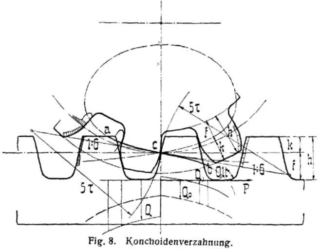 Keywords: L-Verzahnung6.png de Konchoidenverzahnung Fig 8 mit Konchoiden als Eingrifflinie ist als ein zwischen Evolventen- und Zykloidenverzahnung vermittelndes System vorgeschlagen 3 bestimmt durch kreisbogenförmige Kopf- und Fußkurven für die Zähne der Zahnstange vom Radius 5 t deren Mittelpunkte auf einer mit der Neigung 1 6 durch den Teilriß gehenden Geraden liegen Die nach Fig 1 zu entwickelnden Radzahnkurven schmiegen sich erhaben und hohl aneinander und gehen schräg durch die Teilkreise die beim Einbau der Räder auf Berührung einzustellen sind Die Seitendrucke halten günstige Mittelwerte zwischen denen der andern Systeme ein ebenso die Abnutzungscharakteristik deren Höchstwerte berechnet für 16 auf 48 Zähne 4 sich für Zykloiden Konchoiden und Evolventen wie 2 6 6 8 verhalten Für die Zahnhöhen sind in 3 mit Rücksicht auf Fettigkeit im allgemeinen niedrige Werte in Vorschlag gebracht doch kann man für Konchoidensatzräder bis herab zu neun Zähnen die sonst üblichen Maße ohne weiteres anwenden Triebe von vier bis acht Zähnen sind besonders auszubilden Lexikon Verzahnungen Lueger Lexikon der gesamten Technik S 39715 vgl Lueger Bd 8 S 794 Lueger Lueger/Machine elements Drawings of gears and gearboxes |