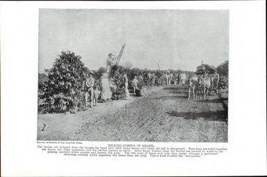 | Keywords: LA2-NSRW-1-0485.jpg Picking coffee in Brazil The berries are stripped from the boughs by hand and with many leaves and twigs let fall to the ground Then they are raked together the leaves and twigs separated and the berries packed in sacks After being washed clean the berries are carried in water to the pulping machine which crushes and loosens the pulp The wet mass of beans and pulp then passes through a perforated revolving cylinder which separates the beans from the pulp This is what is called the wet system Image Picking coffee in Brazil jpg NSRW original see below LA2-NSRW Coffee in Brazil People picking coffee |