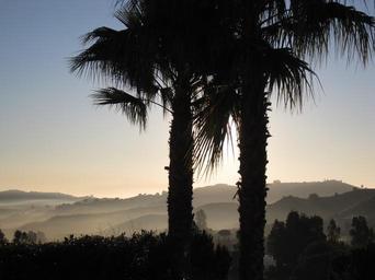 Keywords: la cala de migas spain sunrise morning palms palm trees fog mountains trees sky clouds silhouettes nature outside landscape scenic