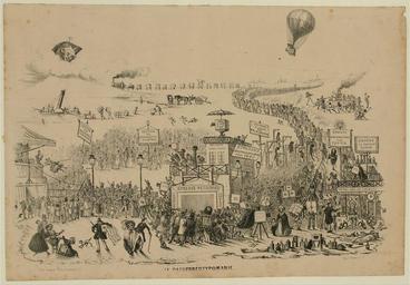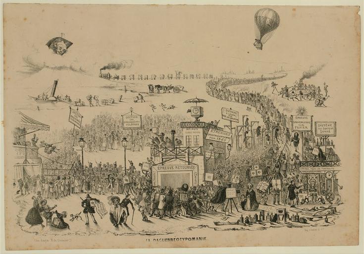 | Keywords: La Daguerréotypomanie - Théodore Maurisset.jpg French cartoon about the rush to try photography after Louis Jacques Mandé Daguerre revealed his process in 1839 Print shows long lines of people waiting to be photographed and others eager to support the craze by providing training and a vast array of photographic equipment Several men hanging from gallows Potences à louer pour MM les graveurs represent the death of art in the birth of photography A balloon hovers in the air with a large camera as its basket LOC-image ppmsca 02343 1839-12 Théodore Maurisset 1803-1860 PD-US Theodore Maurisset French active about 1839 - Daguerreotypomania - Google Art Project jpg La Daguerréotypomanie jpg PD-old-100 1839 lithographs Théodore Maurisset Louis Daguerre Daguerreotype process Balloon baskets 1839 cartoons 1839 in France Photography in art Template artwork possible |
