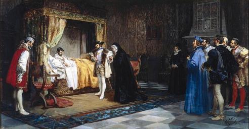 | Keywords: La duquesa de Alençon es presentada a su hermano, el rey de Francia Francisco I, por el emperador Carlos V (Museo del Prado).jpg La obra representa el momento en que el emperador Carlos I de España 1500-1558 presentó en la torre de los Lujanes de Madrid al rey Francisco I de Francia que había sido hecho prisionero en la batalla de Pavia a la hermana de este ultimo Margarita de Angulema que fue duquesa consorte de Alençon y reina consorte de Navarra por su matrimonio con Enrique II de Navarra 1887 oil on canvas Size cm 203 108 Institution Museo del Prado Depositado en el Institution Consejo de Estado de España https //www museodelprado es/coleccion/obra-de-arte/la-duquesa-de-alenon-presentada-a-su-hermano-el/96312c29-232b-4a3d-bfba-5bb86ddf7b71 accession number P05960 https //content museodelprado es/imagenes/Documentos/imgsem/96/9631/96312c29-232b-4a3d-bfba-5bb86ddf7b71/3d4cce73-ed93-40b7-96a5-a4b417dd641c jpg PD-old-100 Francis I of France Charles V Holy Roman Emperor in paintings Marguerite de Navarre Manuel Arroyo y Lorenzo Casa y Torre de los Lujanes Spanish 19th-century paintings in the Museo del Prado Paintings in the Consejo de Estado de España 1887 paintings in Spain |