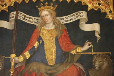 | Keywords: La Giustizia in trono di Jacobello del Fiore, Trittico della Giustizia (1).JPG Art photo Q27077942 Creator Jacobello Del Fiore title Justice between the Archangels Michael and Gabriel La Justicia entre los arcángeles Miguel y Gabriel Giustizia tra gli arcangeli Gabriele e Michele <br> alternate title title Triptych of Justice Trittico della Giustizia it Gallerie dell'Accademia - MIBAC 0270422853-MIBAC 2014 en Justice seated between two lions and the archangels Michael and Gabriel She holds her attributes sword and scales it simbolo della Divina Sapienza tra due leoni che rimandono al trono di Salomone La Giustizia regge con la destrala spada e porta con la sinistra la bilancia San Michele sorregge la bilancia e trasfigghe il drago L'angelo guerriero e difensore della chiesa - nella sua duplice funzione di pesatore di anime e di combattente contra il drago simbolo di Satana 1421 Tempera on panel size cm 208 490 LangSwitch Mittelteil central panel centre/panneau central middenpaneel cm 208 194 ; Saint Michel cm 208 133 ; Saint Gabriel cm 208 163 Institution Gallerie dell'Accademia Venice 01 01 Institution Gallerie dell'Accademia Venice 01 01 http //www gallerieaccademia it/sale/sala-i Gallerie dell'Accademia<br>Richard Hunter S P Oakley Latin Literature and its Transmission https //books google de/books id A6fZCgAAQBAJ pg PA178 lpg PA178 dq Jacobello+del+fiore+Justice+between+the+Archangels+Michael+and+Gabriel source bl ots WGbh7hEoFM sig tvNmvN_O702pDIBvEUkwy3SFFAM hl de sa X ved 0ahUKEwiczeqc2azOAhVIthQKHd6QBf0Q6AEIZjAN v onepage q Jacobello 20del 20fiore 20Justice 20between 20the 20Archangels 20Michael 20and 20Gabriel f false books google object history it eseguito per la sede del Magistrato del Proprio in Palazzo Ducale; acquisizione 1884 con le soppressioni credit line accession number Cat 15 photo date 2014-09-10 11 23 21 own Mongolo1984 photo license cc-by-sa-3 0 it PD-old-100-1923 DEFAULTSORT Jacobello Del Fiore Triptych 7 Accademia Galleries Venice Jacobello Del Fiore - Justice between the Archangels Michael and Gabriel - Accademia Venice D08 Details of Italian Gothic paintings Details of 15th-century paintings Paintings of Justice Paintings with Latin inscriptions Images from Wiki Loves Monuments 2014 in Italy Uploaded via Campaign wlm-it Images from Wiki Loves Monuments 2014 Images from Wiki Loves Monuments 2014 in Italy needing check |