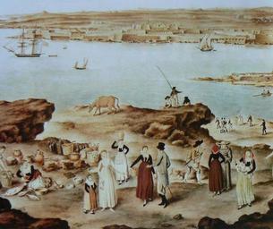 Keywords: La Mola per Giuseppe Chiesa.jpg ca veu el port de Maó l'any 1770 vist des del cap de La Mola detail Museu Hernandez Sanz de Maó painting Creator Giuseppe Chiesa 1770 Port of Mahon 1770 Spain in the 1770s Giuseppe Chiesa