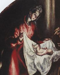 | Keywords: La Natividad, de El Greco (detalle 2).jpg Artwork Q6461660 Creator El Greco La obra representa el nacimiento del Niño Jesús que se halla junto a sus padres la Virgen María y San José Procede de una Adoración de Pastores que El Greco había realizado para el Colegio de Doña María de Aragón en este caso la escena se simplifica a un Nacimiento sin la presencia de los pastores El Greco pinta una escena tenebrosa sólo interrumpida por la luz que emana de la figura del Niño Jesús De esta manera el pintor intenta representar que en el momento de la alumbramiento de Jesucristo es cuando el Mundo conoce la Luz Divina y presenta al Niño como foco de luz que guía a la humanidad en su camino hacia la Verdad En este lienzo también se aprecian escorzos típicos del pintor como la original intrusión de la cabeza retorcida del buey en primer plano bajo los pies de María que enfatiza aún más la idea de que estos cuadros fueron realizados para ser visto desde abajo between 1603 1605 Oil on canvas 128 cm de diámetro Institution Santuario de la Virgen de la Caridad de Illescas http //www elgrecoillescas com/la-natividad/http //www digibis com/elgreco_digimus/es/musobjects/2610 html ctx freetext 3A9 object history credit line accession number http //www digibis com/elgreco_digimus/es/musobjects/2610 html ctx freetext 3A9 PD-old-100 La Natividad de El Greco Santuario de la Virgen de la Caridad de Illescas Details of paintings by El Greco |