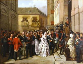 | Keywords: La reina Isabel II y su esposo, visitando el monumento de Jueves Santo en la iglesia de Santa María (Museo de Historia de Madrid).jpg La obra representa a la reina Isabel II de España 1830-1904 y a su esposo el rey Francisco de Asís de Borbón 1822-1902 visitando el monumento del Jueves Santo en la desaparecida iglesia de Santa María de Madrid que fue demolida en 1868 1855 oil on canvas Size cm 89 72 Institution Museo de Historia de Madrid http //ceres mcu es/pages/Main accession number 00003 283 http //ceres mcu es/pages/Main PD-old-100 Portrait paintings of Isabella II of Spain Portrait paintings of Francis of Assisi of Bourbon Ramón Soldevila y Trepat 19th-century paintings in the Museo de Historia de Madrid 1855 paintings in Spain |