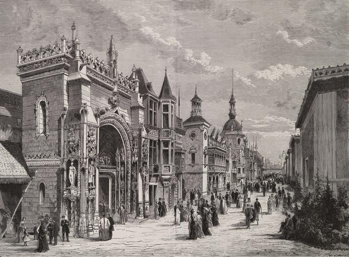 Keywords: La rue des nations, dans le Palais du Champ-de-Mars, vue générale prise près de la façade portugaise.jpg View of the attractions inside the Palais du Champ-de-Mars rue des nations This section of the exhibit was a street composed of pavilions from the different countries that participated in the fair The buildings from left to right are the Portuguese Pavilion the façades of the Luxembourg Andorra pointed tower-like façade and Republic of Saint-Marin Pavilion the Central America Pavilion with the square tower and the flags on the flat roof the Danish Pavillon the Greek pavilion with columns and a pediment and the Belgian pavilion with a hexagonal tower 1879 engraving 22 4 x 30 7 cm Institution Brown University Library object history exhibition history credit line Published in Simon de Vandière L'Exposition universelle de 1878 illustrée Paris Calmann Lévy 1879 accession number 1254173015449692 PD-old Exposition pavilions of Portugal 1878 Images of Paris from the Brown University Library L'Exposition universelle de 1878 illustrée Exposition Universelle 1878 Pavillon Portugal Engravings of Paris Palais du Champ-de-Mars 1878 Neo-Manueline architecture |