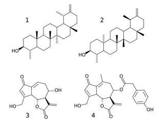Keywords: Lactuca compounds.svg Chemical compunds appearing in species of Lactuca lettuce plants 1 - α-Lactucerol Taraxasterol ; 2 - β-Lactucerol Lactucon Lactucerin ; 3 - Lactucin; 4 - Lactucopicrin 2006-03-15 own assumed Ayacop Pictures formerly showing a librsvg bug Check categories 2016 January 1 Lactuca sativa