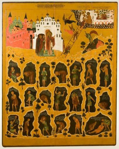 | Keywords: Ladder of Divine Ascent (GIM).jpg ВИДЕ ИЕ ПРЕПОДОБ ОГО ИОА А ЛЕСТВИЧ ИКА Конец XVI начало XVII века осква Де ево; темпе а 181 х 142 х 4 Поступила в 1930-е годы аходилась в музее « оводевичий монасты ь» а основании записи во Вкладной книге оводевичьего монасты я 1674 1675 годов икона считается вкладом на помин души боя ина Евт опия о озова ГИ инв 103803 И I 3039 http //www svyatayarus ru/data/icons/129_vision_of_st_john_of_ladder/index php Конец XVI начало XVII века anonymous PD-Art Exhibition Sainte Russie Moscow 2011 - icons The Ladder of Divine Ascent Files uploaded by Shakko from various sources 16th-century icons in Moscow State Historical Museum Icons of Novodevichy Convent House of Morozov 17th-century icons in Moscow State Historical Museum |