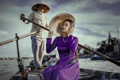 Keywords: lady boat woman fashion style elegant man female attractive lifestyle luxury glamour asian hat dress violet river shooting photography
