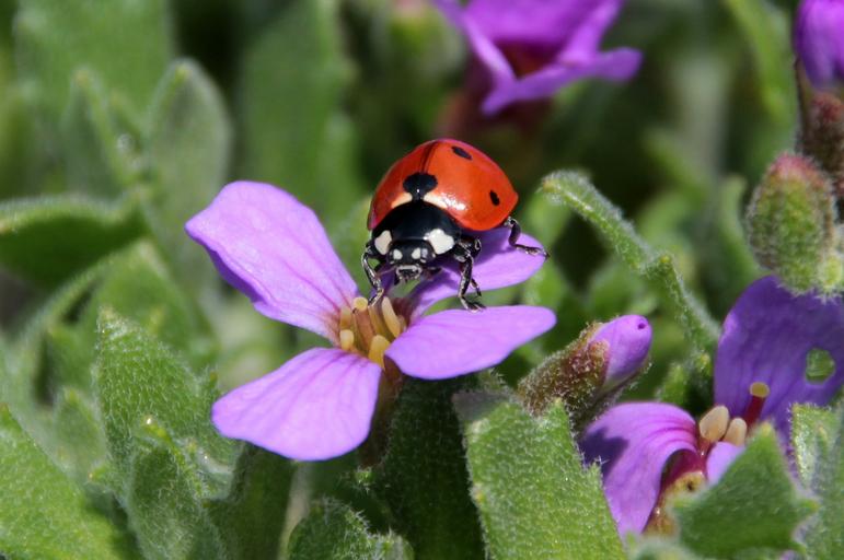 Keywords: ladybug beetle coccinellidae insect nature red points small lucky charm blossom bloom periwinkle vinca