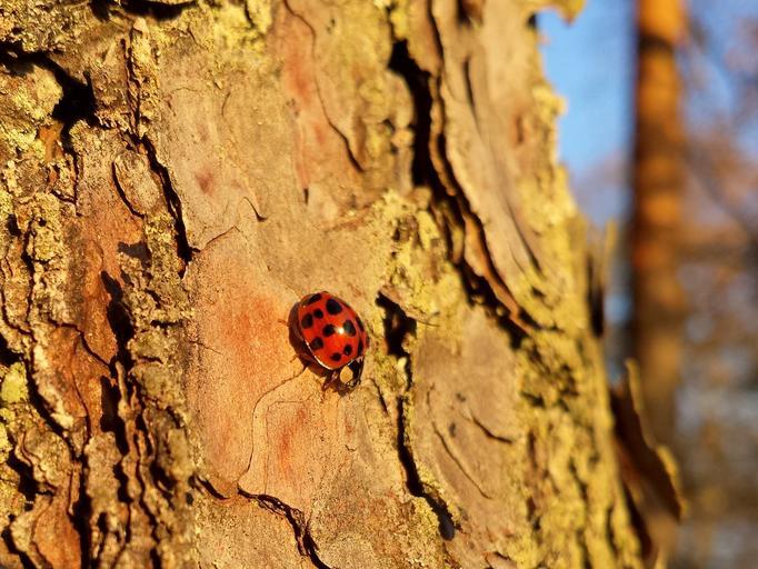 Keywords: ladybug lady beetle ladybird beetle forest tree branch bark evening sun