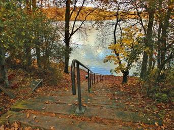 Keywords: lake bank stairs idyllic autumn idyll flakesee brandenburg germany