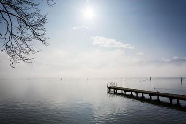 Keywords: lake bridge web wood railing post wooden posts mountain traunstein gmunden traunsee tuscany park mirroring winter landscape mountains alpine cold fog icy nature water quiet rest road tree branches sun sunbeam light austria