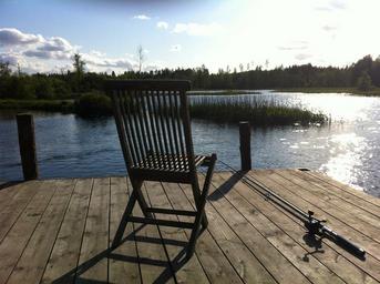 Keywords: lake fish rest mood peaceful nature fishing rod wooden chair break