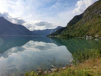 Keywords: lake fjord mirroring sky clouds water mountain mountains steep quiet smooth nature landscape norway shiny clear air reflection