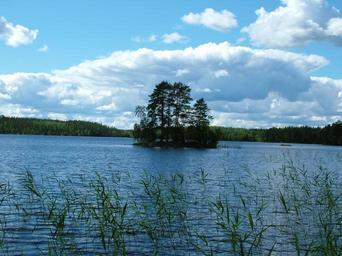 Keywords: lake island small trees finnish reeds sky clouds water