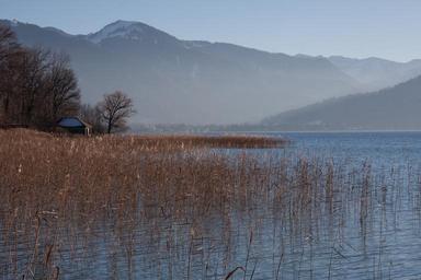 Keywords: lake mountains panorama bank sky water blue rest sunny landscape nature web boardwalk winter wintry haze reed phragmites australis grass poaceae marsh plant bluegrass