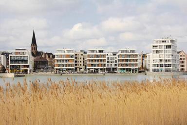 Keywords: lake plant water reed bank idyllic nature leaves lake rose mirroring new building homes dortmund