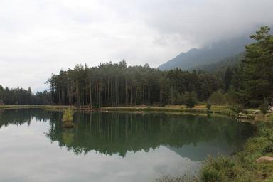Keywords: lake pond mirroring water landscape italy south tyrol voells forest trees mountains rest bergsee
