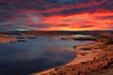 | Keywords: lake powell arizona sunrise glowing sky clouds early morning usa outdoor activities water sport boating swimming wind surfing recreation nature landscape red rocks summer scenery natural natural water lake reservoir countryside scenic weather mood |