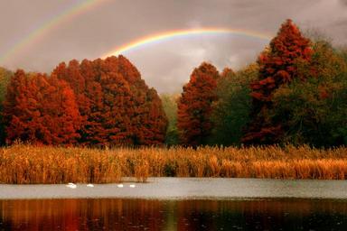 Keywords: lake rainbow trees red swans landscape autumn coloring