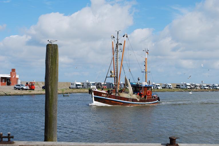 Keywords: lake sea port harlesiel fishing boat gull bollard mobile homes sky clouds water