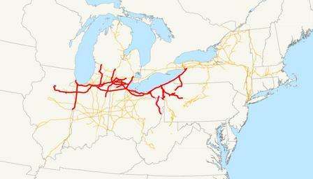 | Keywords: Lake Shore and Michigan Southern Railway system map (1914).svg This is a map of the Lake Shore and Michigan Southern Railway as of 1914 drawn on the New York Central system as of 1918 with trackage rights in purple Email me if you would like a copy of the GIS data I created modified from Bureau of Transportation Statistics North American Transportation Atlas Data or if you see any errors This map does not include the Cleveland Cincinnati Chicago and St Louis Railway system which the LS MS controlled but did not operate See Image Cleveland Cincinnati Chicago and St Louis Railway system map 1918 svg for those lines It also does not include the New York Chicago and St Louis Railroad which the LS MS and NYC controlled until 1916 2008-11-13 own assumed NE2 System maps of defunct U S railroads Lake Shore and Michigan Southern Railway Maps of New York Central Railroad |