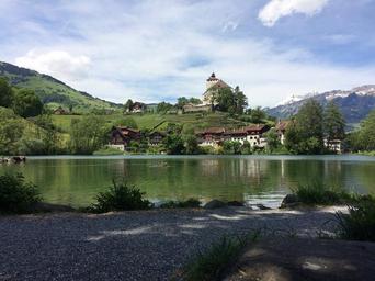 Keywords: lake summer switzerland mountains village landscape water sky holiday swim clouds beautiful