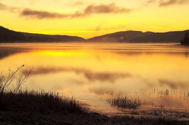 Keywords: lake sunset colorful reflection orange glassy steam fog peaceful romantic calm water sky landscape nature evening scene outdoor view idyllic glow yellow