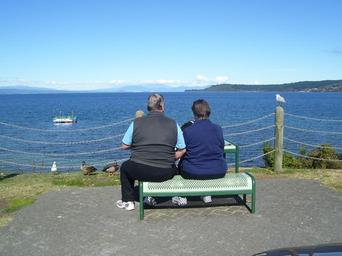 Keywords: lake taupo water blue shore boat hills bench sitting view relax new zealand
