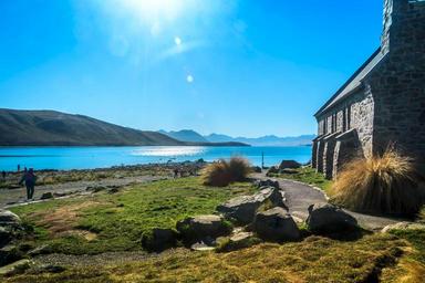 | Keywords: outdoor Lake Tekapo is the second-largest of three roughly parallel lakes running north–south along the northern edge of the Mackenzie Basin in the South Island of New Zealand (the others are Lake Pukaki and Lake Ohau). It covers an area of 83 square kilometres (32 sq mi), and is at an altitude of 700 metres (2,300 ft) above sea level. The lake is fed at its northern end by the braided Godley River, which has its source in the Southern Alps to the north. The lake is a popular tourist destination, and several resort hotels are located at the township of Lake Tekapo at the lake's southern end. The Lake Tekapo Regional Park, administered by Environment Canterbury, is located on the southern shore of the lake. Situated on the shores of Lake Tekapo is the Church of the Good Shepherd, which, in 1935, was the first church built in the Mackenzie Basin. en.wikipedia.org/wiki/Lake_Tekapo Lake Tekapo is the second-largest of three roughly parallel lakes running north–south along the northern edge of the Mackenzie Basin in the South Island of New Zealand (the others are Lake Pukaki and Lake Ohau). It covers an area of 83 square kilometres (32 sq mi), and is at an altitude of 700 metres (2,300 ft) above sea level. The lake is fed at its northern end by the braided Godley River, which has its source in the Southern Alps to the north. The lake is a popular tourist destination, and several resort hotels are located at the township of Lake Tekapo at the lake's southern end. The Lake Tekapo Regional Park, administered by Environment Canterbury, is located on the southern shore of the lake. Situated on the shores of Lake Tekapo is the Church of the Good Shepherd, which, in 1935, was the first church built in the Mackenzie Basin. en.wikipedia.org/wiki/Lake_Tekapo |